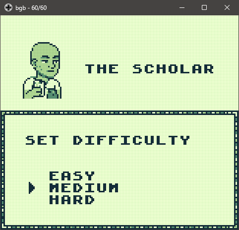 The next few screens allow the player to set up parameters for the game: they pick an opponent (which corresponds to a different AI), they set the difficulty (which affects how tightly the AI will follow its strategy) and the side they play with (dark or light). Along with the title screen these are all a state machine, with multiple layers to keep track of options selected.