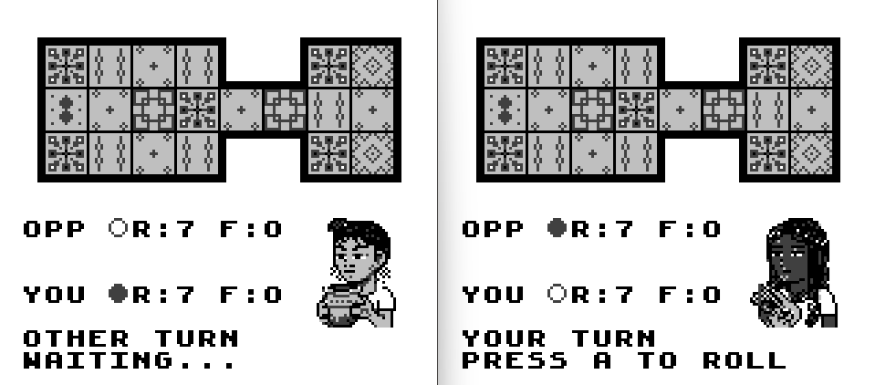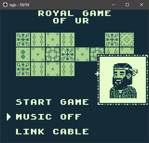 When developing games, creating the assets is often the limiting factor. The Game Boy’s resolution (160×144 pixels) and color palette (2-bit: white, light gray, dark gray, and black) are more forgiving on that front. I’m a developer, not an artist, so a platform where simple graphics are the norm rather than the exception suits me well. And the Royal Game of Ur, with its simple rules and turn-based gameplay, seemed like an ideal fit for these constraints.