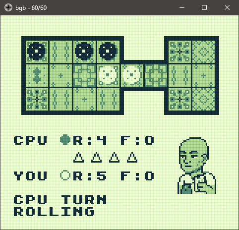 So before starting, I wanted to explore options to implement an AI for the CPU opponent: check if I could come up with a few different playstyles, test how well these worked and optimize parameters. This I opted to do in Python, the language I’m most familiar with, so it made sense to prototype in this environment. This might warrant an entire post dedicated to it by itself, but the concept is relatively simple and very much in line with my post about using an agent-based model, except here we’re not simulating a game … the agents will actually play a game. Different agents can use different strategies (or the same strategy with different parameters), which allows me to pick a few options to include in the Game Boy ROM. I ultimately landed on four strategies that were conceptually distinct enough to link to four different CPU opponents in the game. Those strategies also match the characters’ backgrounds — the merchant, for instance, uses a greedy strategy that goes for the best move in the short run.