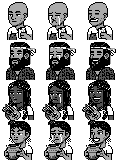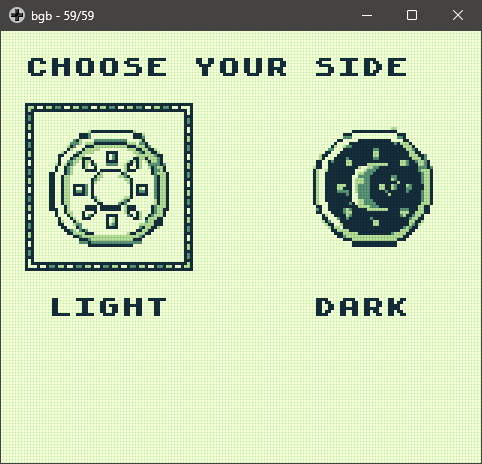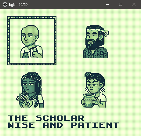 Once that was sorted out, sprites needed to be made. This also gave me some headaches as sprites only use 3 out of 4 colors, one becoming transparent. As I was making sprites one by one, this transparent color was different for each sprite and new sprites were not showing up correctly. Once I figured out the issue was the palette used for sprites, I made all sprites for a given screen together, sharing the transparent color, and set the palette config correctly for each screen.